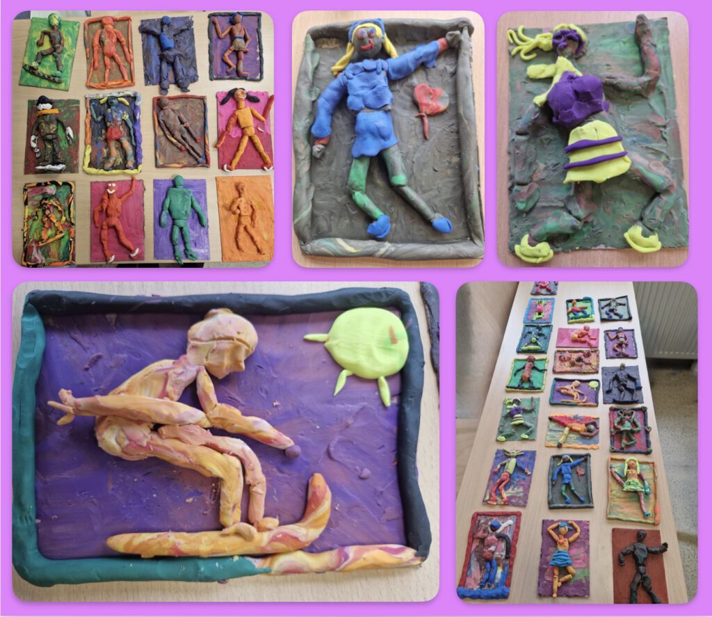 Die Klasse 3 gestaltete passend zu den Olympischen Winterspielen 2026 kreative Reliefs zum Thema „Wintersportler“. Mit viel Begeisterung und Geschick formten die Kinder aus Knete verschiedene Wintersportarten wie Skifahren, Eiskunstlauf oder Snowboarden. Dabei entstanden detailreiche Kunstwerke, die Bewegung und Dynamik eindrucksvoll darstellen.