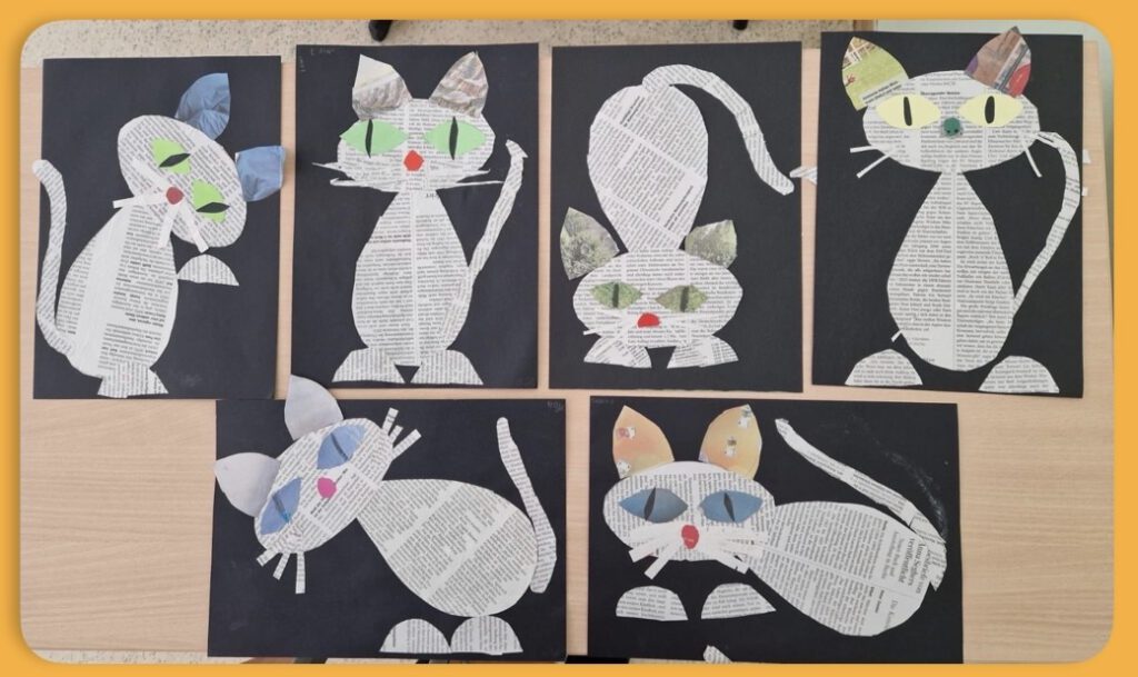 In der Technik der Print-Art gestalteten die Schülerinnen und Schüler aus Zeitungspapier ausdrucksstarke Katzen auf dunklem Untergrund. Durch das Ausschneiden, Anordnen und Aufkleben verschiedener Körperteile entstanden so individuelle Tierporträts.
