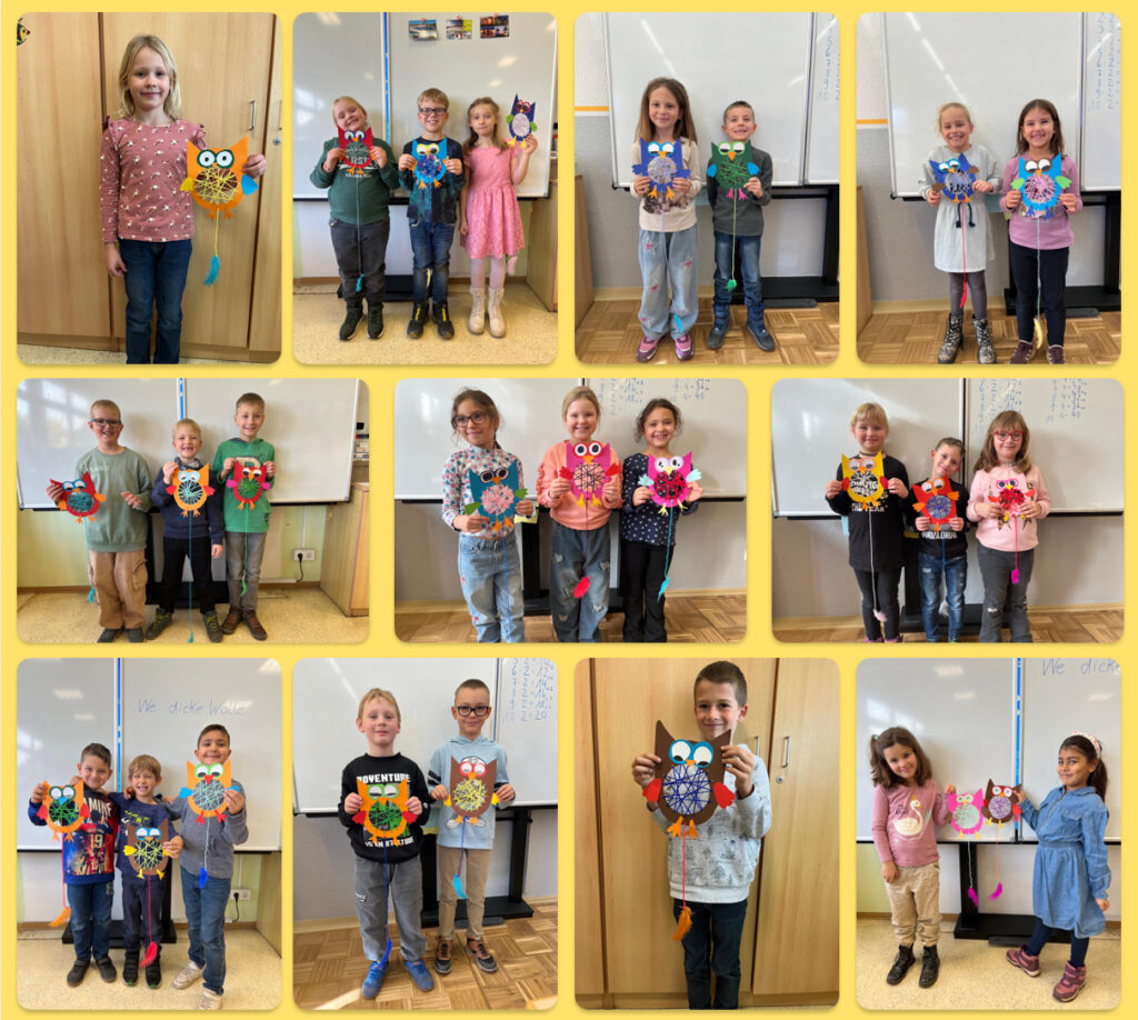 Im Werkenunterricht stellten die 2. Klassen eigene Traumfänger her. Dafür lernten sie nicht nur das Anreißen mit einer Schablone und das anschließende Schneiden an einem kurvenförmigen Riss, sondern auch das Weben eines Netzes. So entstanden niedliche Eulen, die nun die Schlafzimmer der Schülerinnen und Schüler schmücken und alle bösen Träume vertreiben.