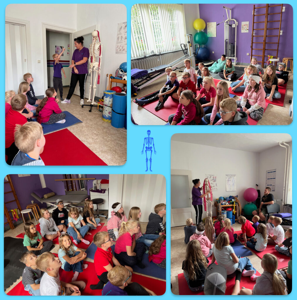 Die Klasse 3b durfte im Rahmen des Heimat- und Sachkundeunterrichts am 01.09.2025 in der Physiotherapie „Mandy Herkt“ ein paar interessante Stunden verbringen. Die Kinder erhielten viele spannende Einblicke rund um das Thema „Skelett – wie stärke ich meine Wirbelsäule?“ und durften dabei sogar verschiedene Übungen gemeinsam ausprobieren.