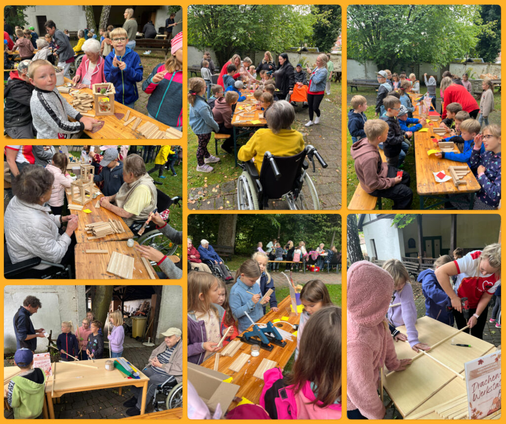 Die Kinder konnten außerdem ihre handwerklichen Fähigkeiten unter Beweis stellen. In der Drachenwerkstatt durften sie ihren eigenen Drachen bauen und bespannen und weiterhin hübsche Laternen und Vogelhäuschen als Dekoration für den Klassenraum basteln. Die Seniorinnen und Senioren standen dabei den Kindern unterstützend zur Seite.