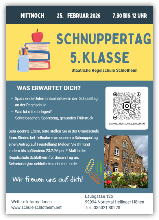 Herzliche Einladung für alle interessierten Viertklässler der umliegenden Grundschulen! (Der Schnuppertag für die Viertklässler der Grundschule Schlotheim findet an einem anderen Termin statt.)